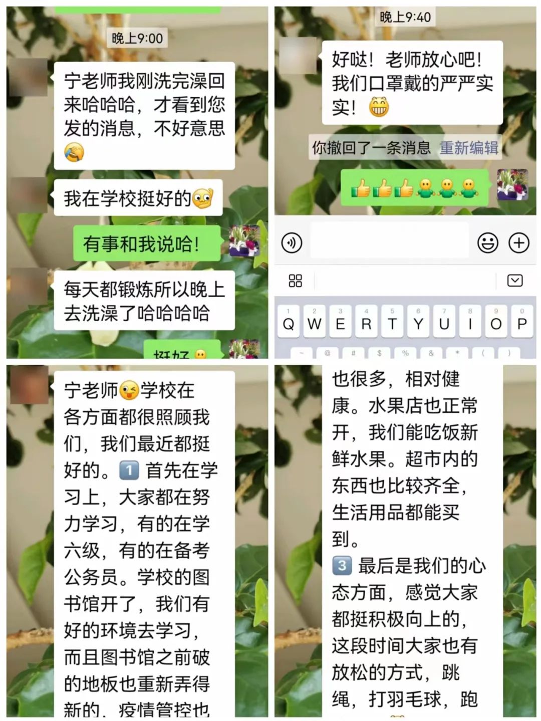 一个电话拉近距离,听见你的声音,我们就很安心;一条微信你来我往,了解你的生活,我们就很开心;一次视频云端相见,看见你的身影,我们就很放心。从每天的沟通中可以看到师生之间的相互关心,可以看到同学们对学校防疫措施的肯定,可以看到同学们对线下教学的期望。