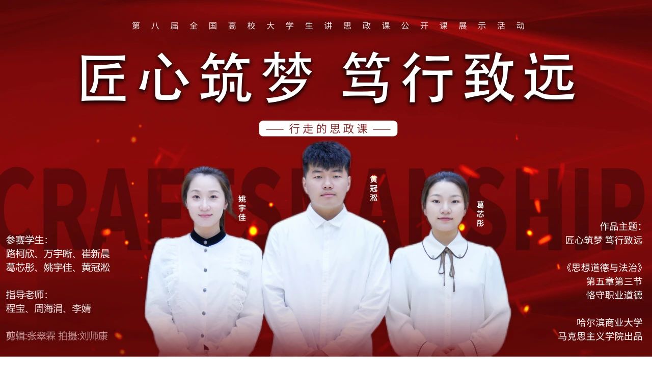 《匠心筑梦 笃行致远》是由马克思主义学院师生共同打造的大学生讲思政课公开课作品。该作品由马克思主义学院程宝、周海涓、李婧三位老师担任指导老师,由马克思主义学院路柯欣、万宇晰、崔新晨负责脚本撰写,黄冠淞、葛芯彤、姚宇佳三位同学主讲。本作品围绕着“何为工匠精神” “新时代需要什么样的‘大国工匠’” “当今大学生如何践行工匠精神”等三个问题,结合哈尔滨工运历史展览馆中的场馆陈列,向大学生们讲解了工匠精神的历史渊源和深刻内涵。通过“行走的思政课”将课本中的知识转化为鲜活的范例,拓展了思政课教学的边界,让思政课“走”出来,“活”起来。