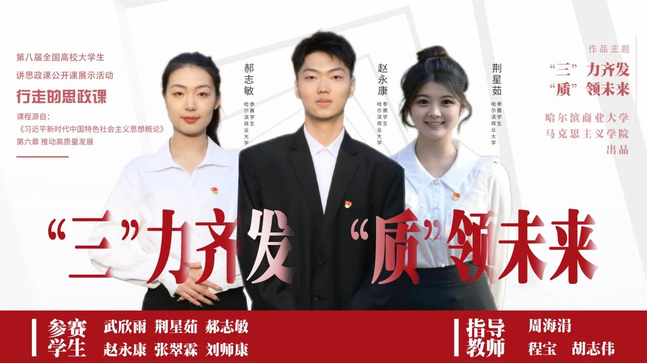 《“三”力齐发 “质”领未来》是马克思主义学院2024年度打造的“行走的思政课”作品,该作品将代表哈尔滨商业大学参加教育部领航计划-第八届全国高校大学生讲思政课展示活动。该作品由马克思主义学院周海涓、程宝、胡志伟三位老师担任指导教师,学生主创团队由马克思主义学院武欣雨、郝志敏、荆星茹,食品工程学院赵永康、会计学院刘师康、旅游烹饪学院张翠霖构成。