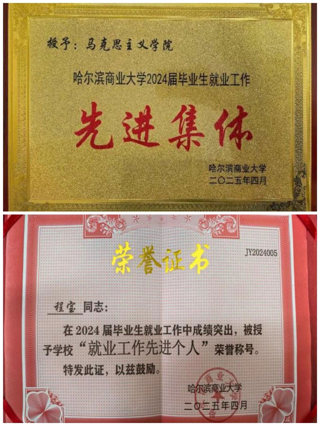 学院在2024届毕业生就业工作中取得优异成果。荣获“哈尔滨商业大学2024届毕业生就业工作先进集体”荣誉称号,辅导员程宝老师获得“就业工作先进个人”荣誉称号。荣誉既是对学院就业工作的肯定,更是激励。马克思主义学院将以此为契机,坚持以学生为中心,凝心聚力,真抓实干,全力以赴做好2025届毕业生就业工作,努力实现毕业生高质量充分就业,争取再创佳绩!