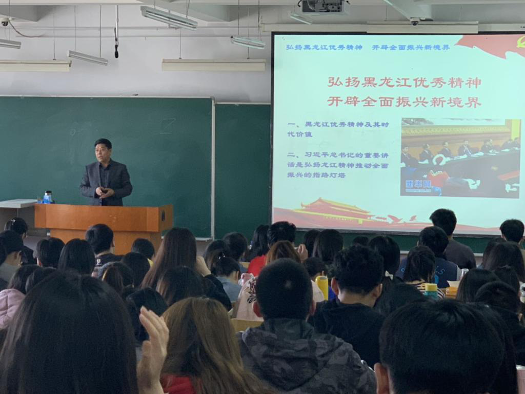 孙先民书记以“弘扬龙江优秀精神,开辟全面振兴发展新境界”为主题,为2016级人力资源管理专业的学生讲授了习近平总书记关于黑龙江振兴发展的相关论述,引导学生传承弘扬东北抗联精神、北大荒精神、大庆精神、铁人精神,鼓励学生立足龙江、扎根龙江,为留省就业创业、助力龙江全面发展振兴做贡献。