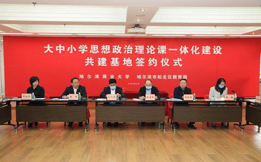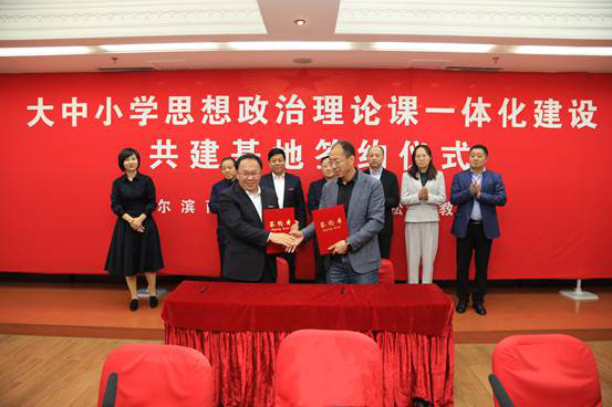 9月28日,我校与哈尔滨市松北区教育局举行松北区“大中小学思政课一体化建设”共建基地签约暨揭牌仪式。省委教育工委宣传部副部长、省教育厅思政处副处长杜海军,哈尔滨市教育局常务副局长冯秋萌,松北区副区长、教育局局长王媛,松北区教育局副局长王连印、王天滨、赵毅科;我校党委书记孙先民,校党委常委、宣传部部长贾妮燕,马克思主义学院党委书记韩煦、院长于景洋出席仪式。马克思主义学院师生代表,松北区教师进修学校、松北区中小学校长及思政课教师代表70余人参加签约活动。副校长张林主持签约仪式。
