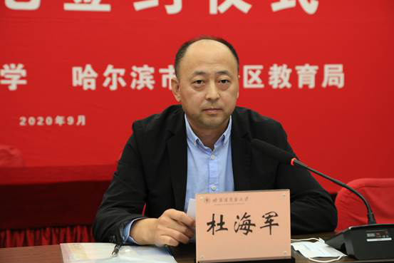 杜海军代表省委教育工委、省教育厅,向双方合作协议的达成,及深度合作的全面展开表示祝贺,向长期致力于思政课教育教学工作的老师们致以问候。杜海军表示,此次共建合作是我省大中小学思政课一体化建设的创新之举,希望双方立足长远,强化主体责任,确保共建工作任务落地落细落实,推动形成良好工作格局,筑牢夯实大中小学思政育人共同体,携手将共建基地打造成松北区思政课创新要素聚集的战略高地。准确把握大中小学思政课一体化建设的总体要求,打通学段之间的障碍,建立与学生年龄特征相符合、与时代特点相适应的思想政治教育体系。严格落实大中小学思政课一体化建设的重要任务,按照习近平总书记提出的“八个相统一”原则,抓好思政课改革创新。注重凝练亮点和特色,形成可复制可推广的大中小学思政课一体化建设典型工作经验,为推进全省大中小学思政课一体化建设进程,深化全省学校思想政治理论课改革创新做出贡献。