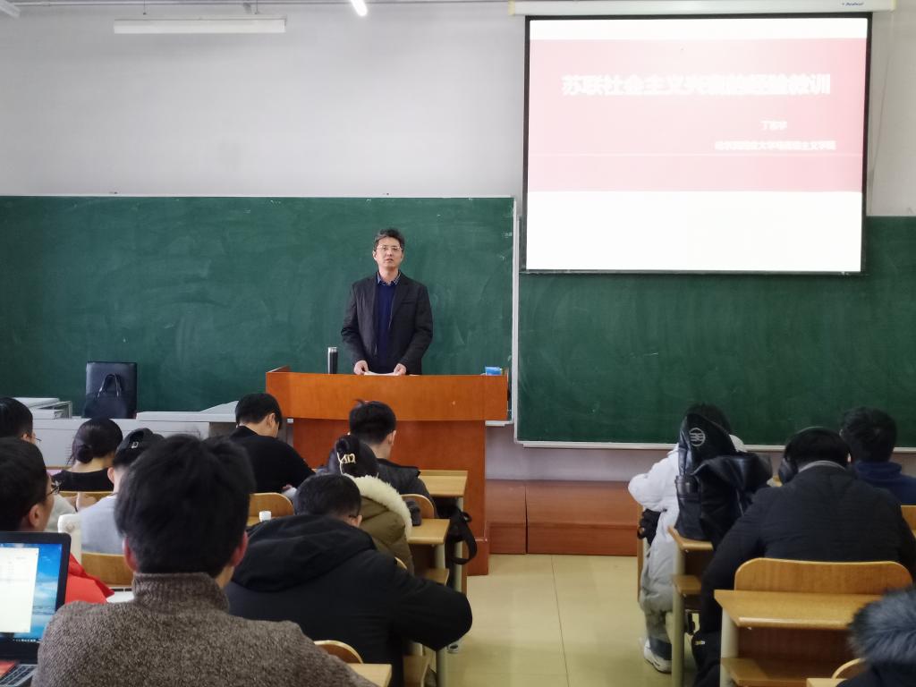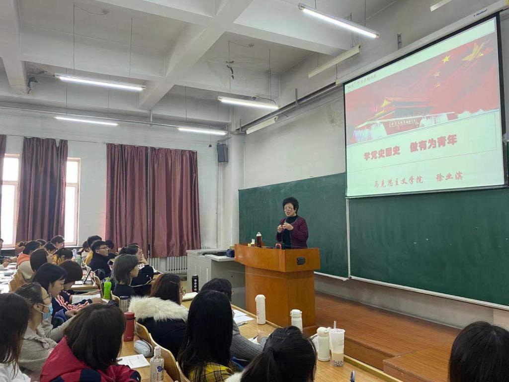 此次“四史”学习教育活动,马克思主义学院组建了一支老中青相结合、理论与实践相促进的“四史”特色宣讲团,主要成员有于景洋、徐业滨、裴桂清、丁东宇、陈江波、张薇、李洁、谷宇新等老师。他们以扎实的学术功底涵养“四史”教育、以鲜活的历史史料活化“四史”教育,以专题讲座的“小杠杆”撬动知史爱党、知史爱国的“大主题”。李洁以《党史讲座:不忘初心,红色起点》为题做专题讲座;于景洋以《共和国史讲座:党的领导体制变革与国家治理体现代化》为题做专题讲座;谷宇新以《党史讲座:中国共产党的工作重心转变的历程》为题做专题讲座;裴桂清以《改革开放史讲座:中国特色社会主义的产生与发展》;张薇以《社会主义发展史讲座:科学社会主义的纲领文献<共产党宣言>及当代价值》为题做专题讲座;陈江波以《改革开放史讲座:开启新时代的伟大征程》为题做专题讲座;徐业滨以《党史、国史讲座:学党史国史,做有为青年》为题做专题讲座;丁东宇以《社会主义发展史讲座:苏联社会主义兴衰的经验教训》为题做专题讲座。