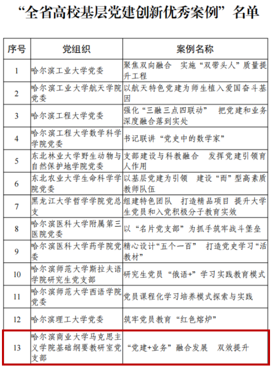 近日,省委教育工委下发了《关于公布全省高校基层党建创新案例评选结果的通知》(黑教工委函〔2021〕8 号)。按照省委教育工委开展全省高校基层党建创新案例征集评选工作安排,经高校党委推荐、专家匿名评审,评选产生“全省高校基层党建创新最佳案例”10 个、“全省高校基层党建创新优秀案例”37 个。我校马克思主义学院基础纲要教研室党支部报送的《“党建+业务”融合发展 双效提升》荣获“全省高校基层党建创新优秀案例”。