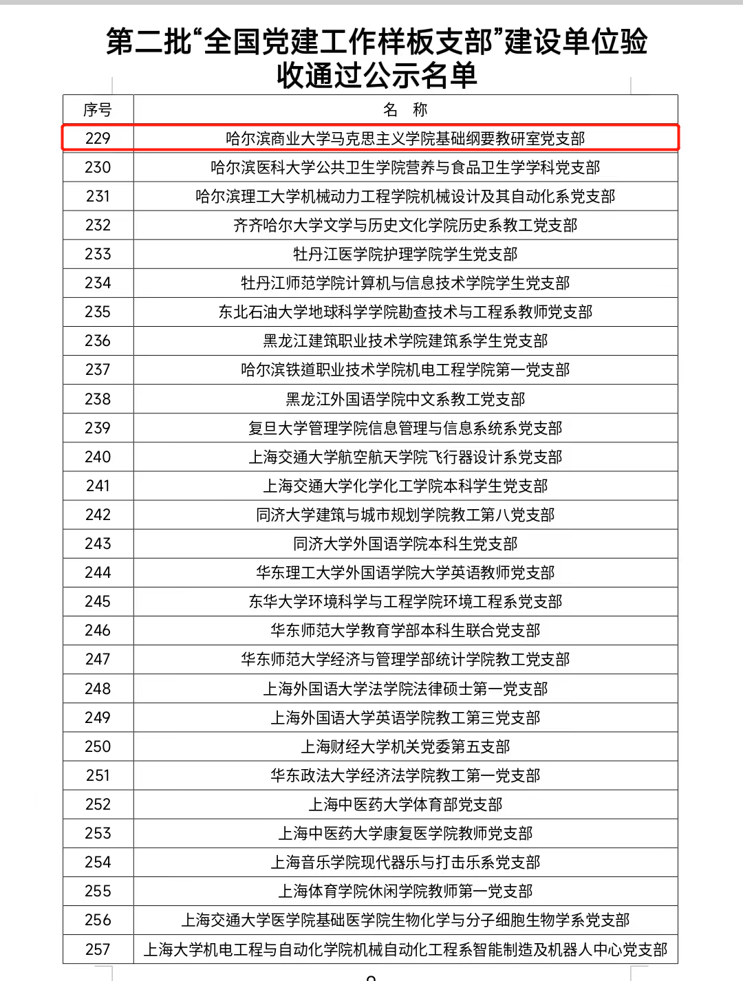 近日,教育部思想政治工作司发布《关于第二批新时代高校党建示范创建和质量创优工作和首批高校“双带头人”教师党支部书记工作室建设单位验收结果的公示》。经建设单位对标自查总结、省级党委教育工作部门把关审核、教育部思想政治工作司审查,马克思主义学院基础纲要教研室党支部顺利通过第二批“全国党建工作样板支部”建设单位验收。