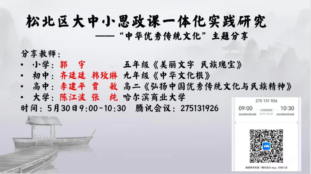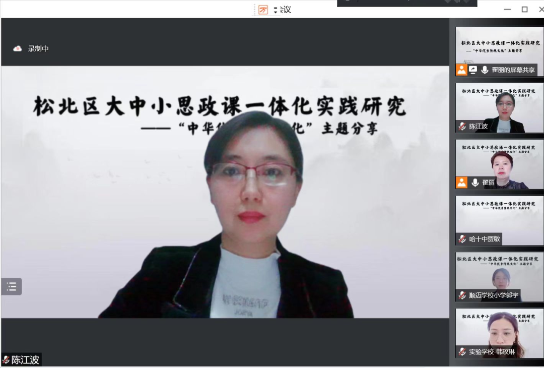 近日,松北区大中小思政课一体化建设基地以“中华优秀传统文化”为主题召开线上教学分享会。来自哈尔滨商业大学、哈尔滨第十中学、呼兰一中、哈尔滨市实验学校、哈尔滨顺迈学校小学部的7位教师,分别针对研究生、大学、高中、初中、小学各学段如何螺旋上升、有效衔接地讲授“中华优秀传统文化”展开了交流,近80位教师线上参会。哈尔滨商业大学马克思主义学院陈江波教授、张纯副教授受邀参会。