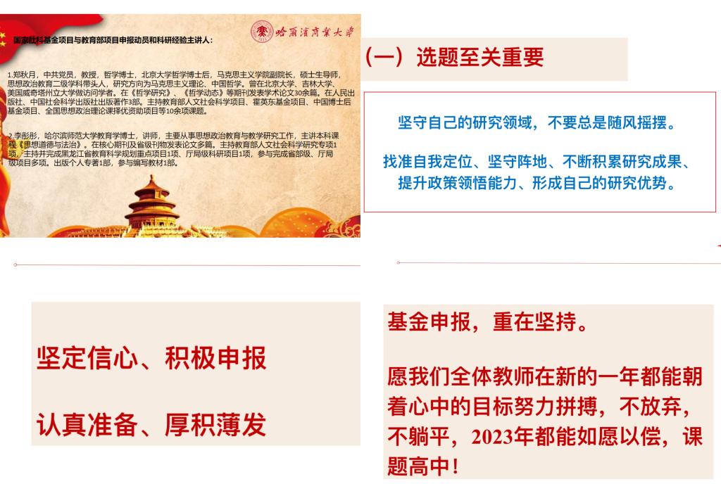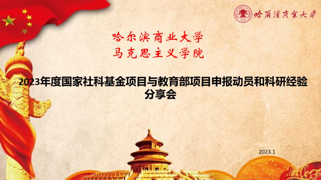 岁月如梭,时光荏苒。在刚刚过去的2022年,马克思主义学院教师喜获国家社科基金高校思想政治理论课研究专项、教育部人文社会科学研究专项任务项目、黑龙江省哲学社会科学研究规划项目和校级项目若干,收获颇丰。在2023年度国家社科基金项目即将申报之际,为提升学院教师申报积极性、主动性,增强信心,凝聚共识,1月11日下午,马克思主义学院以腾讯会议的形式,在线召开2023年度国家社科基金项目与教育部项目申报动员和科研经验分享会,马克思主义学院全体教师参加会议。会议由学院科研秘书汪圣钧老师主持。