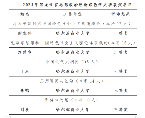 近日,黑龙江省教育厅、黑龙江省教科文卫体工会委员会公布了《2022年黑龙江省高校思想政治理论课教师教学大赛获奖名单》。我校马克思主义学院5位教师斩获佳绩,荣获一等奖1项、二等奖1项、三等奖3项。本次大赛成果丰硕、精彩纷呈,充分展现了马克思主义学院思政课教师的良好素养和教学风采,标志着马克思主义学院在思政课教学质量提升、思政课教师队伍建设等方面取得了长足进步。