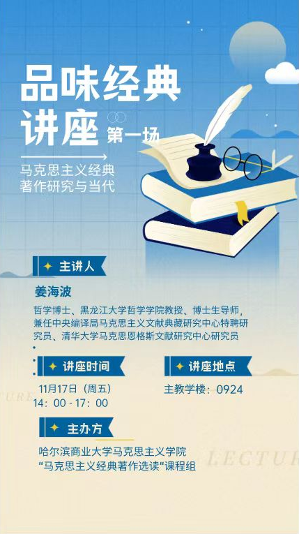 为进一步提高马克思主义理论学科建设水平,培养马克思主义理论研究生的经典著作阅读能力和学术水平,11月17日,马克思主义学院邀请黑龙江大学哲学学院姜海波教授以“马克思主义经典著作与当代”为题做“品味经典”第一场学术讲座,马克思主义学院教师和研究生代表参加。讲座由“马克思主义经典著作选读”课程负责人丁东宇教授主持。