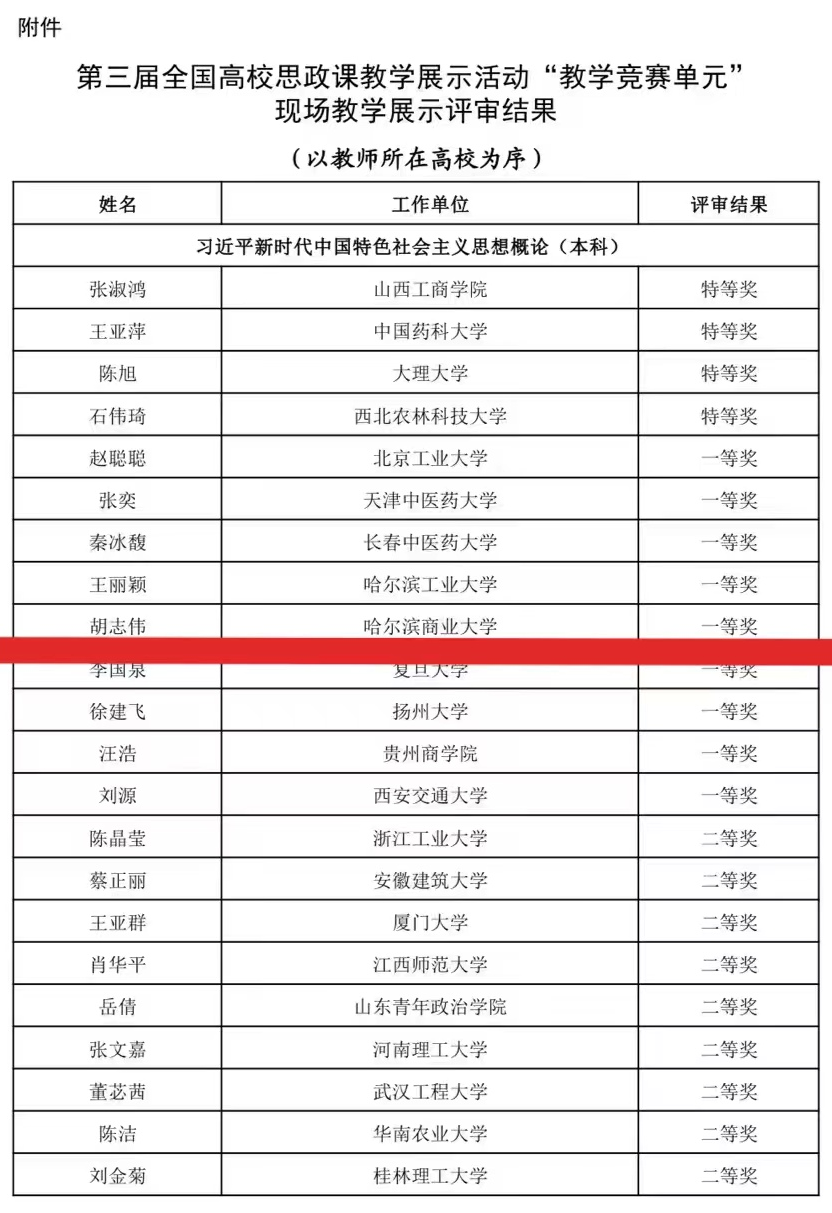 2024年2月18日,由教育部举办的第三届全国高校思想政治理论课教学展示活动“教学竞赛单元”现场教学展示评审结果公布,我院胡志伟老师荣获《习近平新时代中国特色社会主义思想概论》课本科组一等奖。