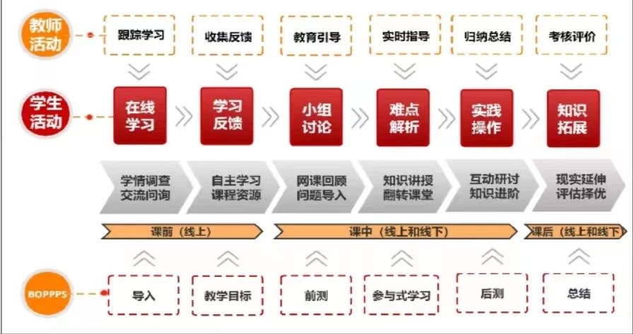 一是打造线上线下混合式六阶段闭环教学模式。“BOPPPS”教学模式为线上线下混合教学的运用提供了一种简洁、清晰、高效的设计思路,打造每一个教学单元“导言-目标-前测-参与式学习-后测-总结”六阶段闭环教学模式,塑造以学生为中心并强调学生全方位参与和及时反馈交流的教学范式。合理、高效地利用线上线下资源,按照教师和学生的各自分工,综合贯穿于课前、课中、课后全过程,从而收获良好的教学效果。