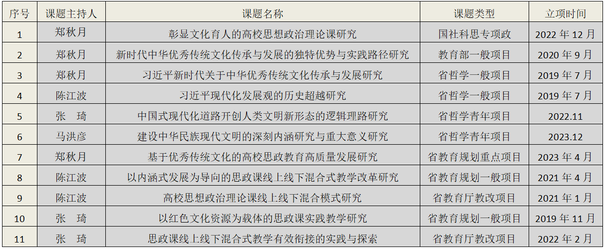 科研成果:近5年,主持国社科思政专项1项,教育部人文社科一般项目1项,省哲学社会科学规划项目4项,省教育科学规划项目3项,省教育厅教育教学改革项目2项。