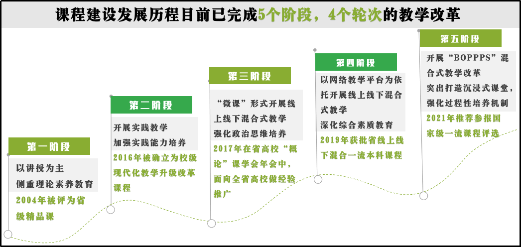 概论教研室课程建设发展历程目前已完成5个阶段,4个轮次的教学改革。其中第三和第四阶段主要依托“微课”录制和网络教学平台探索线上线下混合式教学改革,2019年获批第一批黑龙江省线上线下混合一流本科课程。