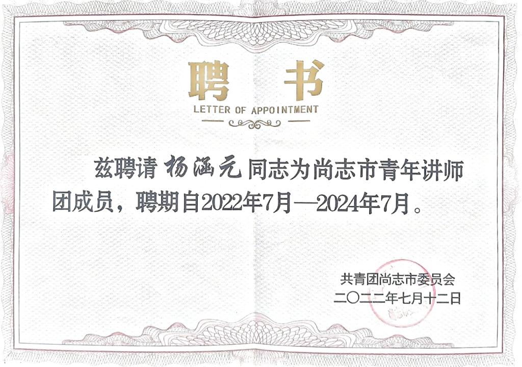 由于杨涵元在宣讲工作中的优异表现,被聘为黑龙江省第二届青年讲师团讲师、尚志市青年讲师团讲师,并被授予“尚志市优秀返家乡大学生”等荣誉称号。