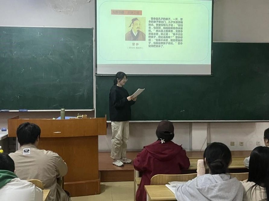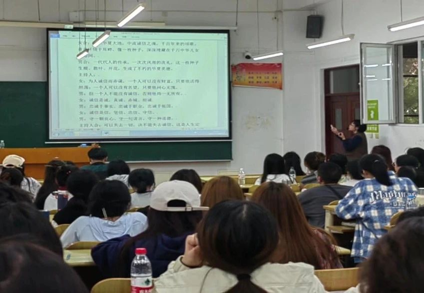 在教师的讲授引导下,每次课前5分钟,学生们围绕着“诚信”开展了学生讲诚信历史小故事、学生讲诚信形势政策、诗歌朗诵、播放诚信微视频等丰富多彩的实践活动,5分钟虽短,却如涓涓细流浸润心灵,在学生内心播下了诚信的种子。