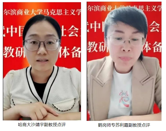 第二阶段为点评环节,点评教师为哈尔滨商业大学马克思主义学院新思想概论教研室副教授沙靖宇、鹤岗师范高等专科学校思政部副教授苏利霞,两位教师围绕本次备课环节的说课内容、教学重难点问题、教学案例的使用等内容进行点评,5所院校共计50名新思想概论课教师在分会场同步观摩学习。