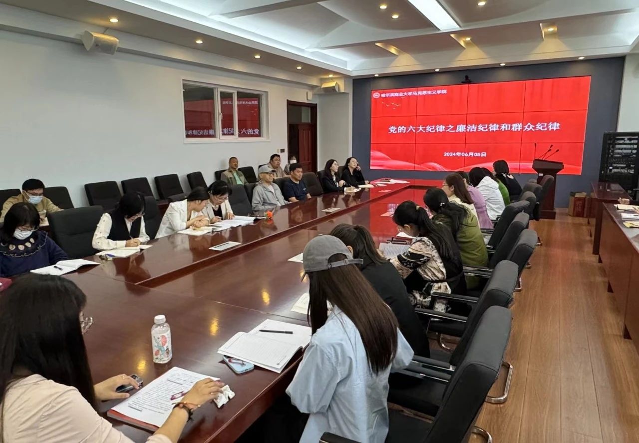 6月5日下午,马克思主义学院进一步深入开展党纪学习教育,暨传承弘扬龙江优秀精神,召开全体教职工大会。会议由马克思主义学院党委书记郑秋月主持,副院长陈江波及学院全体教师参加会议。郑秋月首先传达5月29日学校党委理论学习中心组召开的学习会议精神,传达学习校党委书记赵广就如何全面深刻领会把握廉洁纪律与群众纪律的主旨要义和规定要求、认真抓好贯彻落实提出的工作要求。
