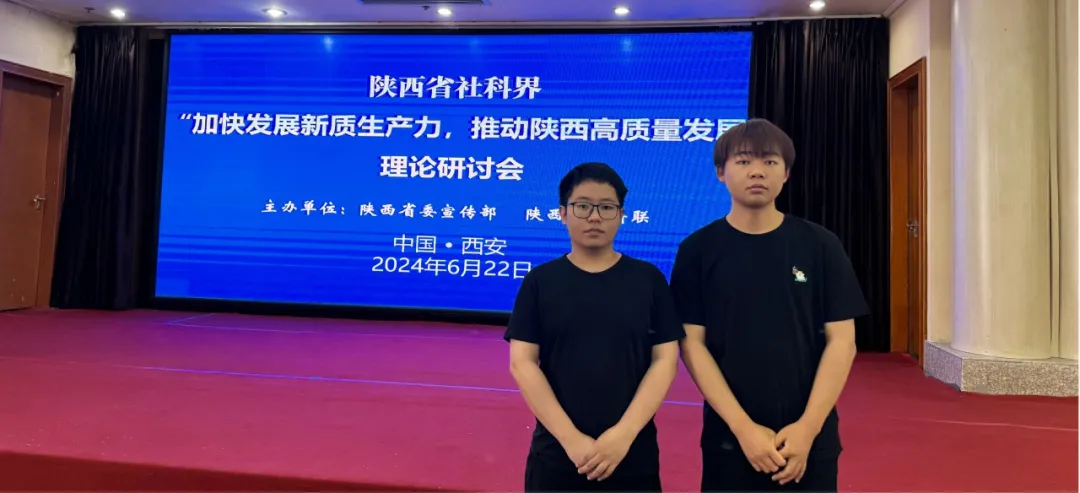 6月22日,由陕西省委宣传部、陕西省社科联联合主办的陕西省社科界“加快发展新质生产力 推动陕西高质量发展”理论研讨会在西安举行。哈尔滨商业大学马克思主义学院2023级研究生张淇茗、黄衍川受邀参会,会上做《新质生产力赋能乡村产业振兴》的研讨交流。