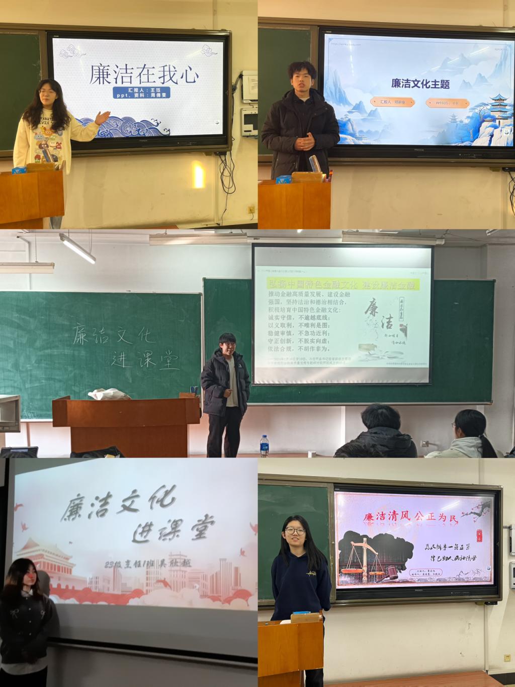 本次活动中,毛泽东思想和中国特色社会主义理论体系概论教研室教师结合课程内容,深入浅出地讲解了廉洁文化的内涵、意义以及在实际生活中的应用,特别强调了中国共产党人在廉洁自律方面的优良传统和实践经验,通过生动的案例分析、丰富的互动环节,引导同学们认识廉洁自律的重要性,并鼓励他们将廉洁文化内化于心、外化于行。同时,同学们围绕“廉洁自律,从我做起”的主题进行了“课前5分钟”实践活动,结合自身学习和生活经历,发表了自己的看法和感悟,不仅加深了同学们对廉洁文化的认识和理解,也推动了廉洁文化在校园内的传播和实践。