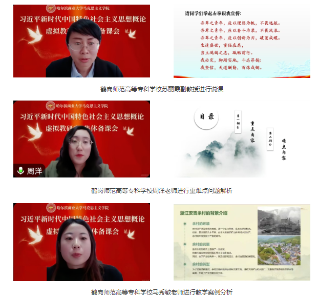 11月20日下午,由哈尔滨商业大学马克思主义学院牵头,绥化学院、哈尔滨信息工程学院、鹤岗师范高等专科学校、黑龙江交通职业技术学院共计5所院校“新思想概论”课教师共同参与的新思想概论课虚拟教研室第四次集体备课活动顺利举行,本次备课活动由鹤岗师范高等专科学校思政部领备,采用线上与线下相结合方式进行。五所院校共计50余名新思想概论课教师在分会场同步观摩学习。