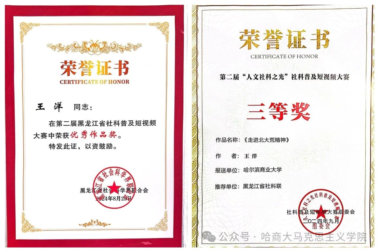 近日,经过推荐和评选,我院教师王洋的作品《走进北大荒精神》荣获第二届黑龙江省社科普短视频大赛优秀作品奖和第二届“人文社科之光”社科普及短视频大赛三等奖。