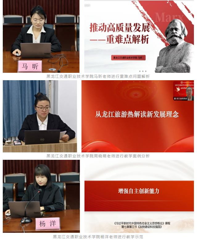 第一阶段为备课环节,由黑龙江交通职业技术学院基础教育部(马克思主义学院)新思想概论教研室三位教师进行展示。马昕老师对第六章《推动高质量发展》进行重难点问题解析;周晓萌老师选取了《龙江旅游热经济》案例,分析为什么要贯彻新发展理念,什么是新发展理念以及黑龙江省在新发展理念指导下经济社会发展取得了哪些新成效;杨洋老师围绕《增强自主创新能力》进行教学示范,杨洋老师以案例“中国高铁如何逆袭惊艳全球”作为课程导入,从筑梦与圆梦——增强自主创新能力,要着力推进基础研究;改革与突破——增强自主创新能力,要着力推动应用研究;谋篇与布局——增强自主创新能力,要着力推动前沿研究三个方面进行授课示范讲解。