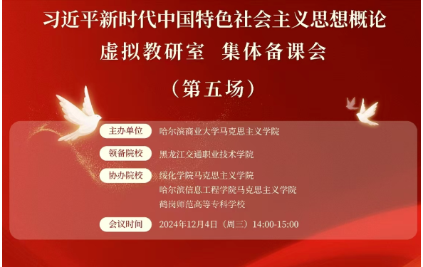 12月4日下午,由哈尔滨商业大学马克思主义学院牵头,绥化学院、哈尔滨信息工程学院、鹤岗师范高等专科学校、黑龙江交通职业技术学院共计5所院校“新思想概论”课教师协同参与的新思想概论课虚拟教研室第五次集体备课活动顺利举行,本次备课活动由黑龙江交通职业技术学院基础教育部(马克思主义学院)领备,采用线上与线下相结合方式。五所院校共计50余名新思想概论课教师在分会场同步观摩学习。