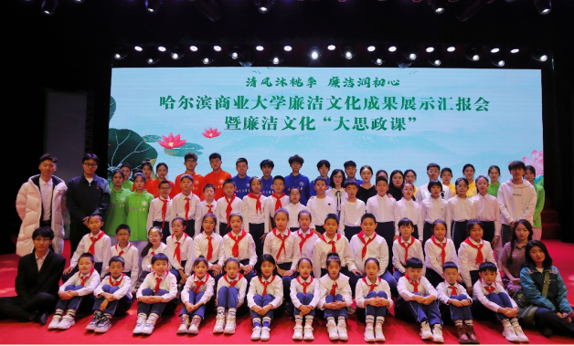 12月7日下午,哈尔滨商业大学在南区大礼堂举办了“清风沐桃李 廉洁润初心”廉洁文化成果展示汇报会暨廉洁文化“大思政课”,集中展示学校廉洁文化建设成果,学校领导班子,各基层党委(党总支)书记、副书记,辅导员,思政课教师,以及学生代表共千余人参加本次活动。马克思主义学院“大中小一体化”思政课展示节目《强商报国》,在现场获得了较好反响。