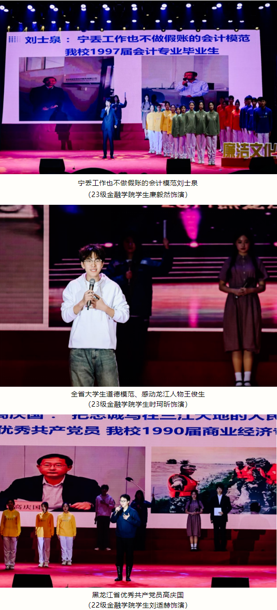 该作品结合我校优秀校友新中国第一代商业劳模吴桂兰,中国漠河北极村第一位女乡村邮员、全国劳动模范、感动中国人物尹静,宁丢工作也不做假账的会计模范刘士泉,一句承诺坚守四年的全省大学生道德模范、感动龙江人物王俊生,用自己的生命践行对党无限忠诚的黑龙江省优秀共产党员高庆国等5位杰出校友的先进感人事迹,生动阐述了廉洁文化在强国建设中的重要作用,引领我校师生树立强商报国的远大志向,筑牢做挺膺担当奋斗者的理想信念,践行“强商报国,奋斗有我”的铮铮誓言。