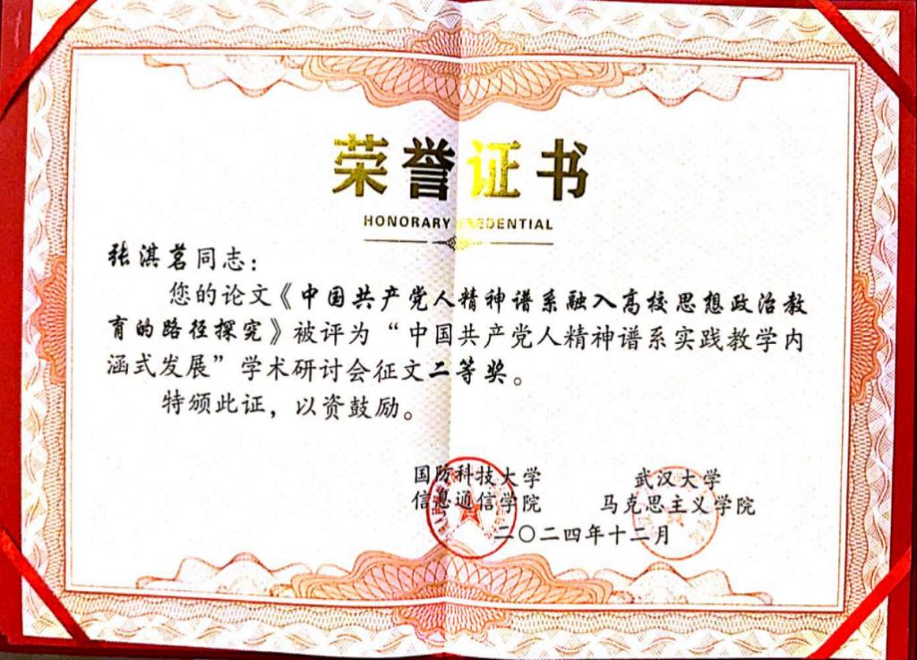 2024年12月21至22日,由国防科技大学信息通信学院、武汉大学马克思主义学院主办的“中国共产党人精神谱系实践教学内涵式发展”学术研讨会在湖北省武汉市举办。我院硕士研究生张淇茗、黄衍川受邀参会,其中张淇茗提交的《中国共产党人精神谱系融入高校思想政治教育的路径探究》一文获评研讨会征文二等奖。