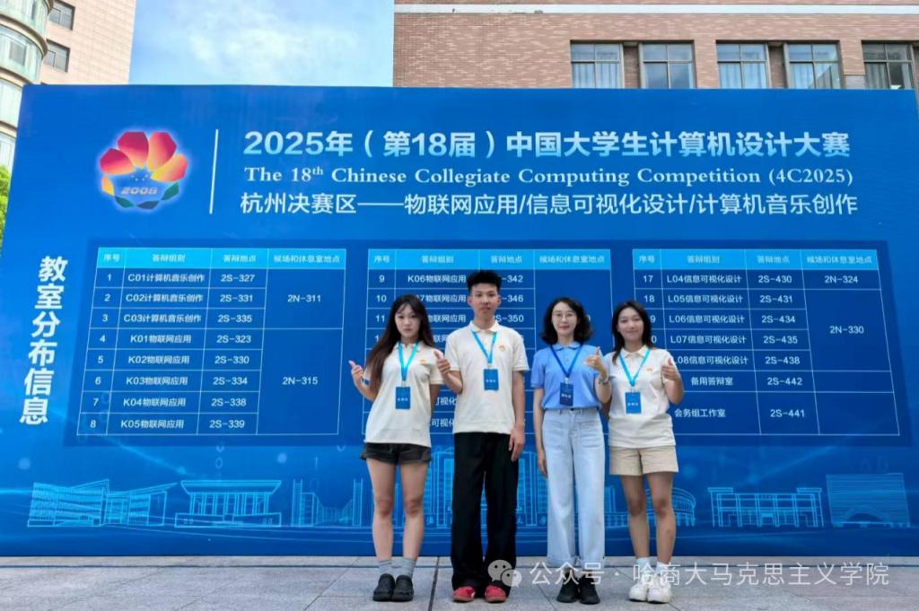 本次比赛在计算机与信息工程学院和马克思主义学院的共同支持下,由马克思主义学院周海涓、设计艺术学院霍文仲担任指导教师,学生团队由来自设计艺术学院、药学院的张开文、张绘智、崔蓉佳、崔哲轩、高铭轩5名同学组成,从省赛到国赛历时8个月的辛苦准备,最终不负众望,取得我校历史上该项目最好成绩。