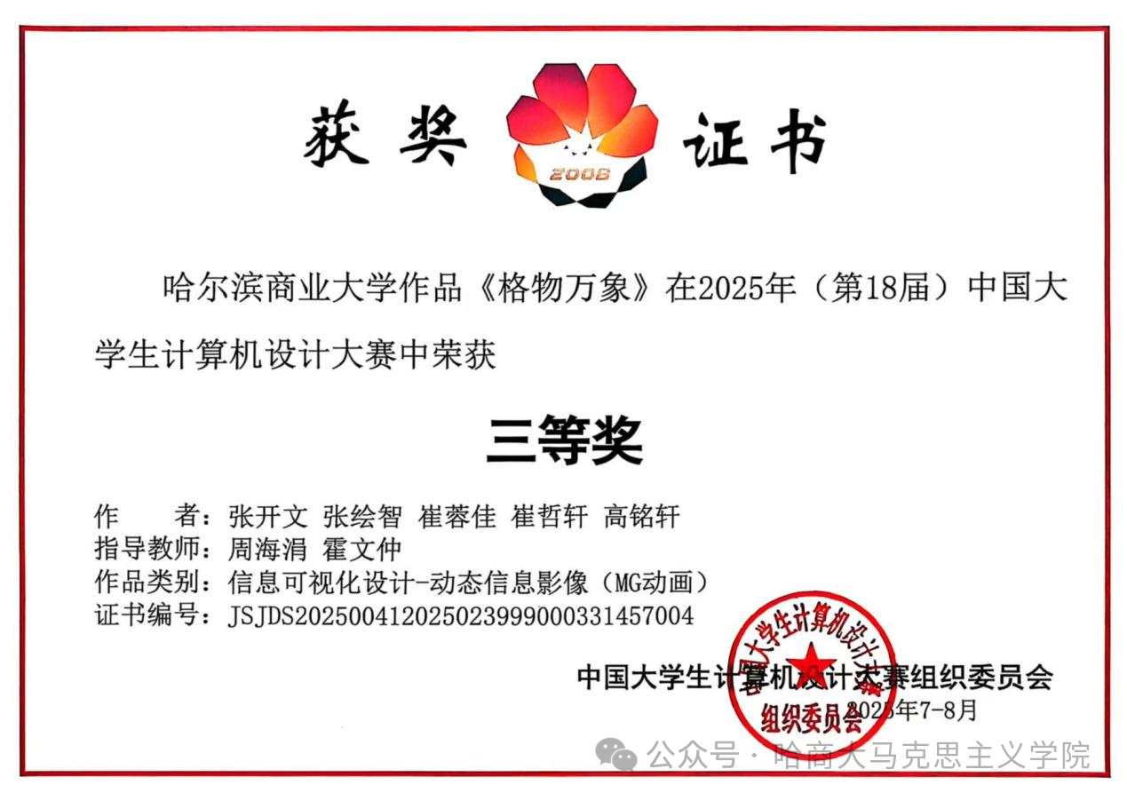 近日,2025年(第18届)中国大学生计算机设计大赛(4C大赛)全国总决赛(杭州赛区)圆满落幕,我院教师周海涓指导学生参赛作品《格物万象》参加黑龙江省“信息可视化设计—动态信息影像(MG动画)”赛获奖后,被推荐代表我省参加该项目的全国总决赛,喜获国赛三等奖。
