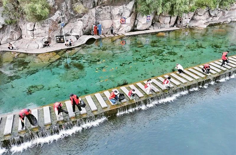 2024年6月5日是世界环境日。世界环境日前后,各地志愿者、环保工作者等以实际行动保护生态环境,守护美丽家园。图为2024年6月4日,志愿者在河北省邯郸市峰峰矿区黑龙洞风景区捡拾水面杂物。新华社发 郝群英/摄