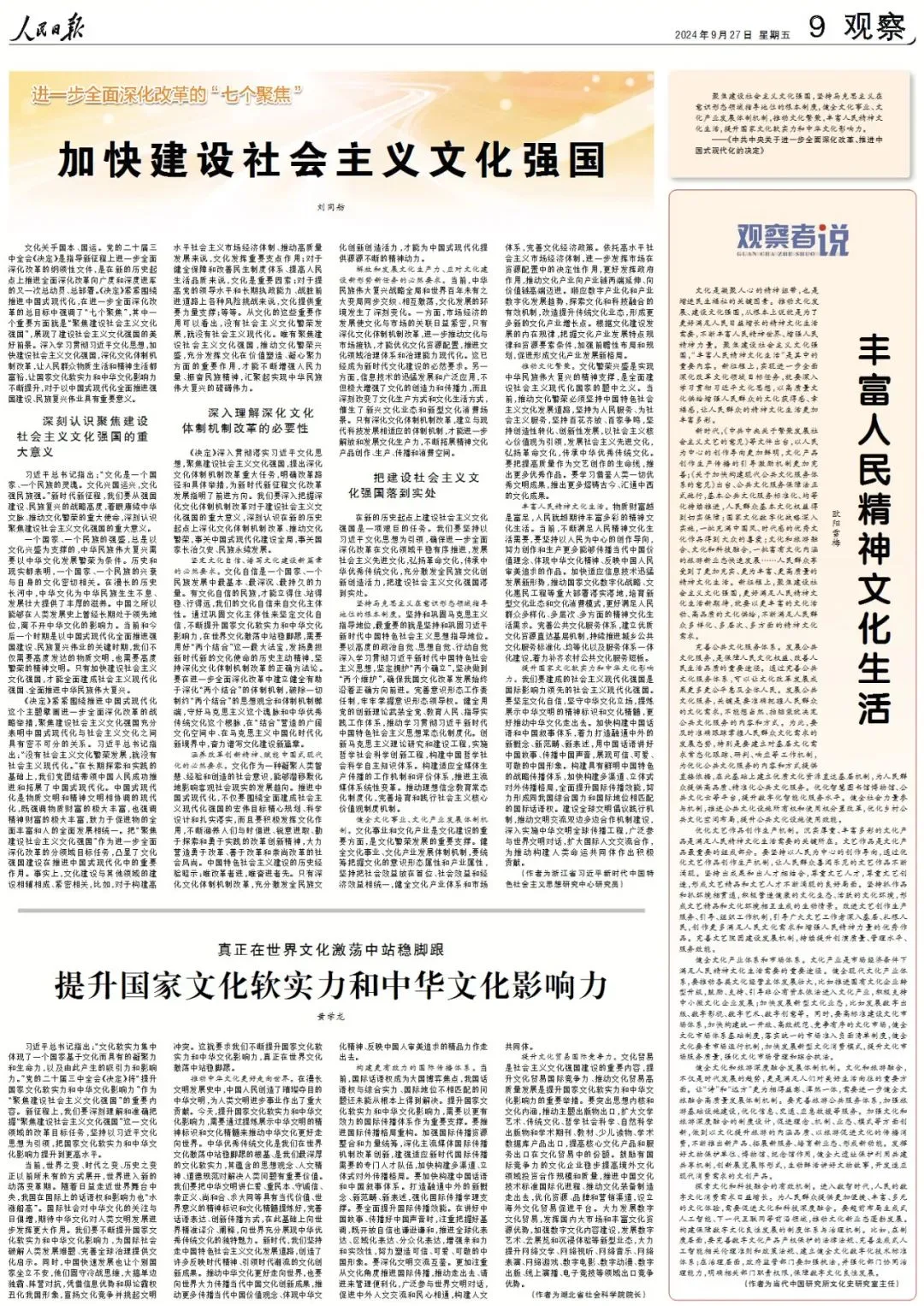 文化关乎国本、国运。党的二十届三中全会《决定》是指导新征程上进一步全面深化改革的纲领性文件,是在新的历史起点上推进全面深化改革向广度和深度进军的又一次总动员、总部署。《决定》紧紧围绕推进中国式现代化,在进一步全面深化改革的总目标中强调了“七个聚焦”,其中一个重要方面就是“聚焦建设社会主义文化强国”,展现了建设社会主义文化强国的美好前景。深入学习贯彻习近平文化思想,加快建设社会主义文化强国,深化文化体制机制改革,让人民群众物质生活和精神生活都富裕,让国家文化软实力和中华文化影响力不断提升,对于以中国式现代化全面推进强国建设、民族复兴伟业具有重要意义。