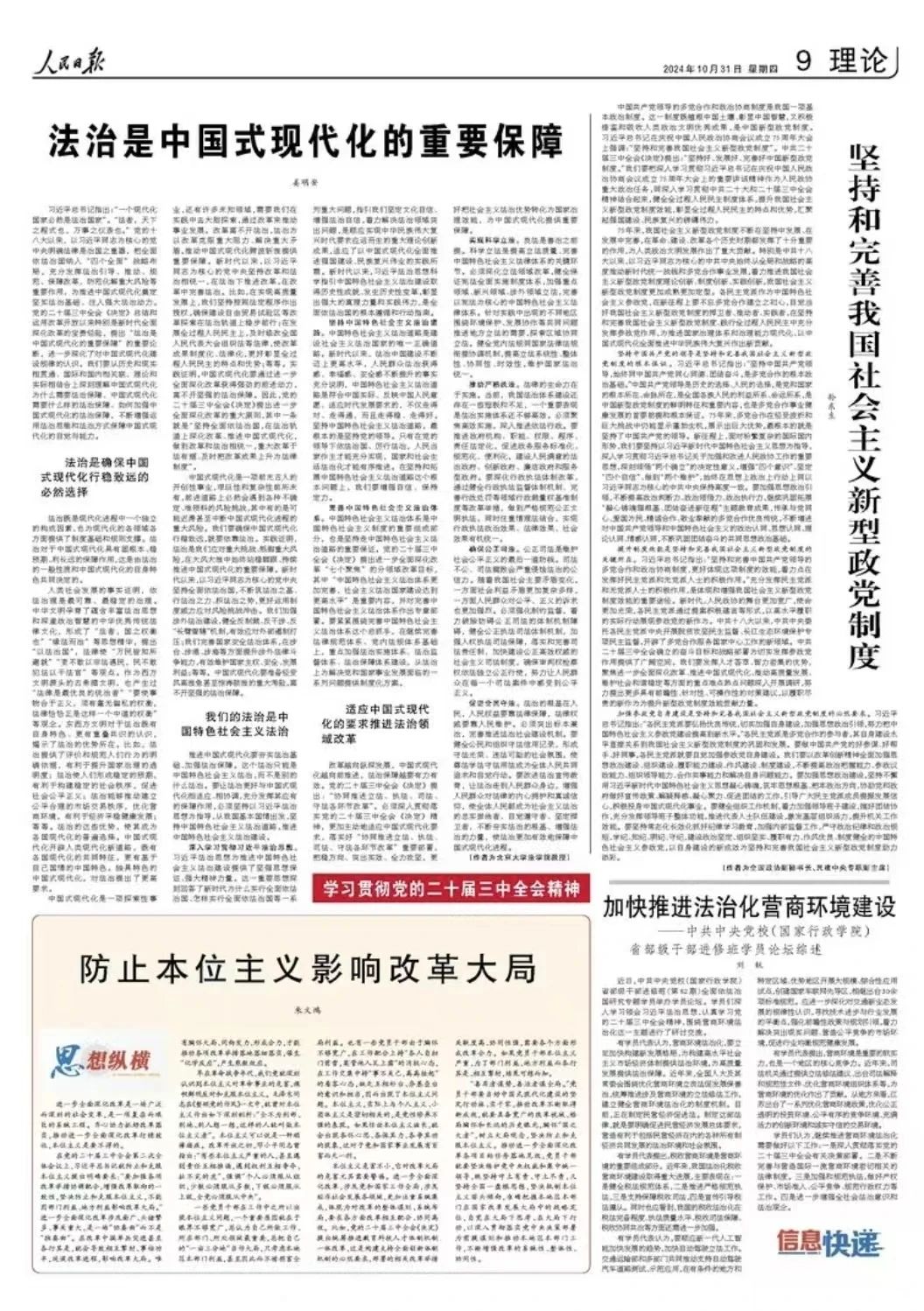 改革越向纵深发展,中国式现代化越向前推进,法治保障越要有力有效。党的二十届三中全会《决定》提出:“协同推进立法、执法、司法、守法各环节改革”。必须深入贯彻落实党的二十届三中全会《决定》精神,更加主动地适应中国式现代化要求,落实好“协同推进立法、执法、司法、守法各环节改革”重要部署,把稳方向、突出实效、全力攻坚,更好把社会主义法治优势转化为国家治理效能,为中国式现代化提供重要保障。