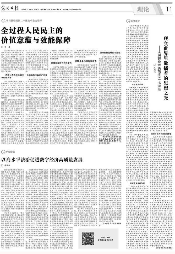 民主是全人类的共同价值,是中国共产党人不懈的价值追求。党的二十届三中全会提出“健全全过程人民民主制度体系”。全过程人民民主不仅是一种理念,而且是有着系统制度支撑的现实实践。全过程人民民主的提出及其在中国制度体系下的展开,不仅承继马克思主义民主观价值内核,也为民主效能的发挥、民主精义的彰显提供了多重保障。