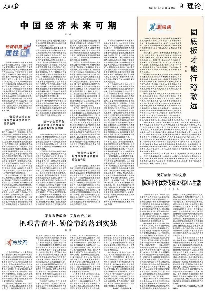 我国经济长期向好的支撑条件和基本趋势没有变。中央经济工作会议指出:“我国经济基础稳、优势多、韧性强、潜能大,长期向好的支撑条件和基本趋势没有变。”尽管经济会受到各种因素影响而发生短期波动,但基本趋势通常不会因此而改变。当前,我国正在构建新发展格局,广阔的市场潜力将得到充分激发,为应对和化解各种困难和挑战提供有力保障;正在积极培育和发展新质生产力,以科技创新推动产业创新,加快建设以实体经济为支撑的现代化产业体系,将为构筑未来发展战略优势提供重要支撑;正着力在发展中保障和改善民生,不断增进人民福祉、促进人的全面发展,将不断提升人力资本,进而提高全要素生产率,夯实高质量发展的动力基础。
