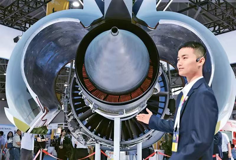 航空发动机是国之重器,是国家科技实力和创新能力的重要体现。这些年,我国航空发动机研制战线坚持自主创新,大力弘扬劳模精神、工匠精神,不断加快航空发动机自主研制步伐,为建设航空强国、实现高水平科技自立自强拼搏奋斗。图为2023年5月26日,参展工作人员在2023中国国际大数据产业博览会现场介绍国产CJ1000A民用大涵道比涡扇发动机。 新华社记者 欧东衢/摄