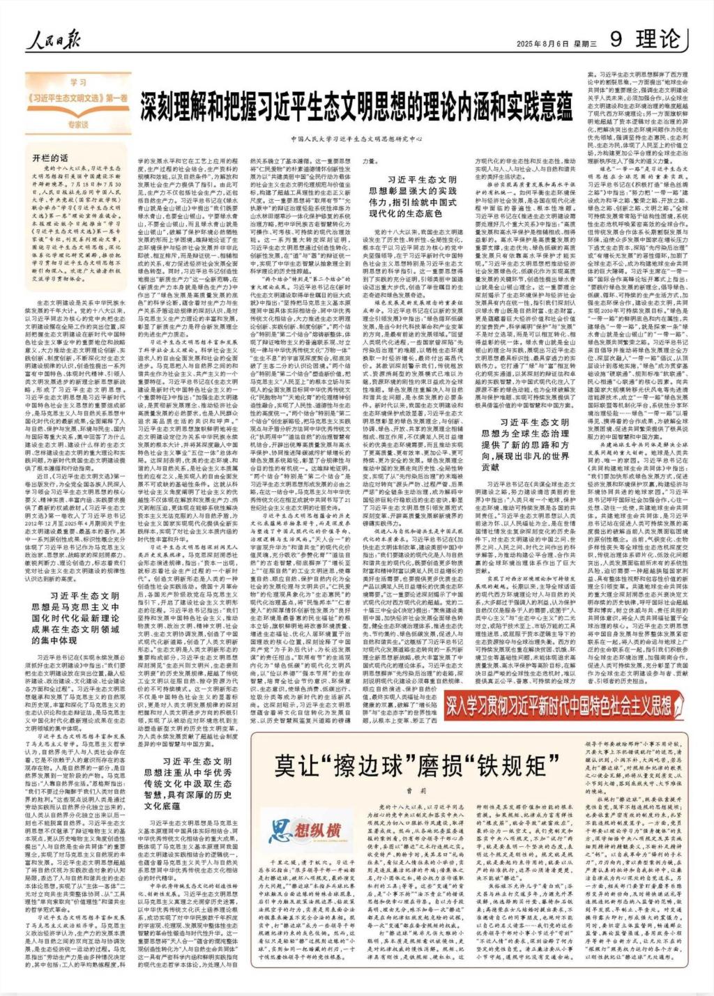 党的十八大以来,习近平生态文明思想指引美丽中国建设不断开辟新境界。7月18日和7月30日,人民日报社先后同中国人民大学、中央党校(国家行政学院)联合举办“学习《习近平生态文明文选》第一卷”理论宣传座谈会。本报理论版今日起推出“学习《习近平生态文明文选》第一卷专家谈”专栏,刊发系列理论文章,围绕习近平生态文明思想,深化体系化学理化研究阐释,推动把学习贯彻习近平生态文明思想不断引向深入。欢迎广大读者积极交流学习贯彻体会。