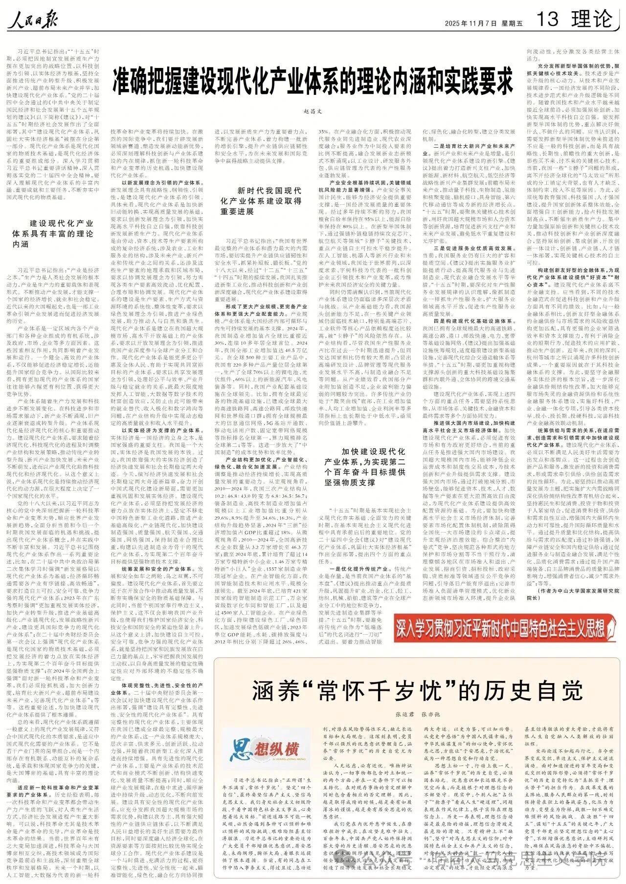 习近平总书记指出:“‘十五五’时期,必须把因地制宜发展新质生产力摆在更加突出的战略位置,以科技创新为引领、以实体经济为根基,坚持全面推进传统产业转型升级、积极发展新兴产业、超前布局未来产业并举,加快建设现代化产业体系。”党的二十届四中全会通过的《中共中央关于制定国民经济和社会发展第十五个五年规划的建议》(以下简称《建议》),对“十五五”时期经济社会发展作出了全面部署,其中“建设现代化产业体系,巩固壮大实体经济根基”被摆在分论第一部分。现代化产业体系是现代化国家的物质技术基础,是现代化经济体系的重要组成部分。深入学习贯彻习近平总书记重要讲话精神,深入贯彻落实党的二十届四中全会精神,要深入理解现代化产业体系的丰富内涵、重要成就和主要任务,不断夯实中国式现代化的物质基础。