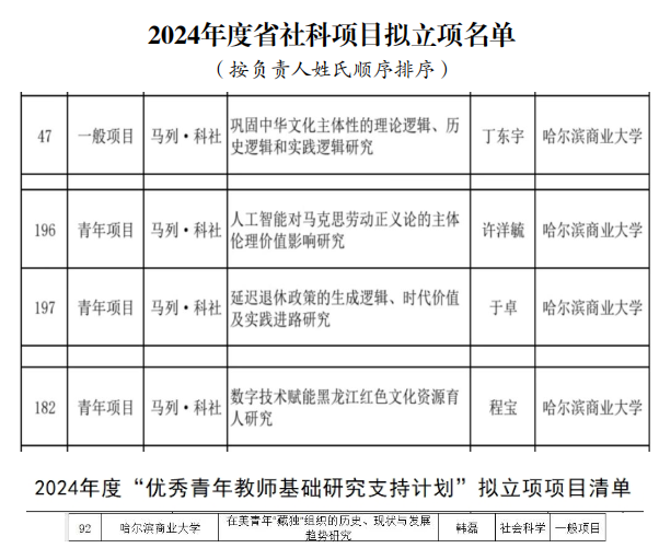 近日,2024年度黑龙江省哲学社会科学研究规划项目评选结果揭晓,我院丁东宇教授、许洋毓副教授、程宝老师、于卓老师获批立项;此前在省教育厅公布的《关于公布2024年度黑龙江省“优秀青年教师基础研究支持计划”立项项目的通知》中,我院韩磊副教授获得2024年黑龙江省省属本科高校“优秀青年教师基础研究支持计划”一般项目立项,在此向以上五位老师表示祝贺!