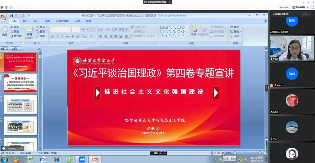 马克思主义学院副院长郑秋月围绕“推进社会主义文化强国建设”专题,面向管理学院党委、商务学院党委、轻工学院党委、食品工程学院党委作专题宣讲。