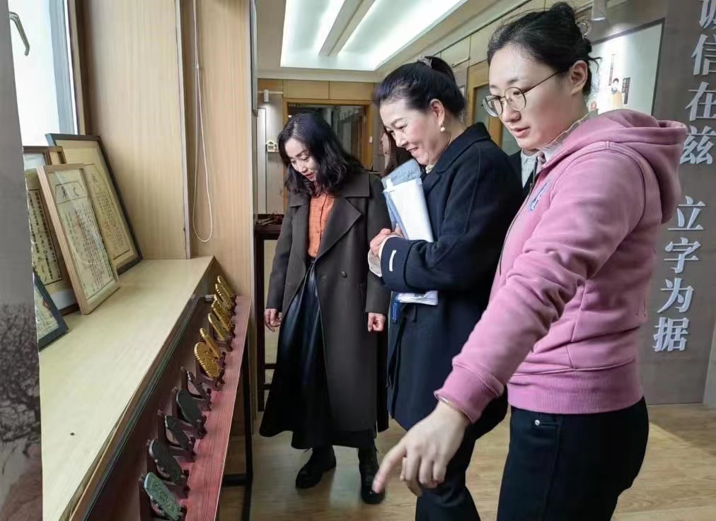 随后,大家来到学校东区B03栋3楼的诚信文化研学馆。诚信文化研学馆是由我校自主建设的全省高校首家以征集、收藏、展示、研究诚信文化为主题的公益性研学馆,管内集中展示了我国诚信思想发展历程,历代有关诚信的故事以及学校诚信建设成果等。联合支部成员逐一参观着“诚信中国”专题展区、诚信廉洁文创研学体验区、诚信文化主题工作室……深刻感受到“诚信是中国传统美德,世代薪火相传,做商业就是讲诚信,老字号是诚信的符号……”。
